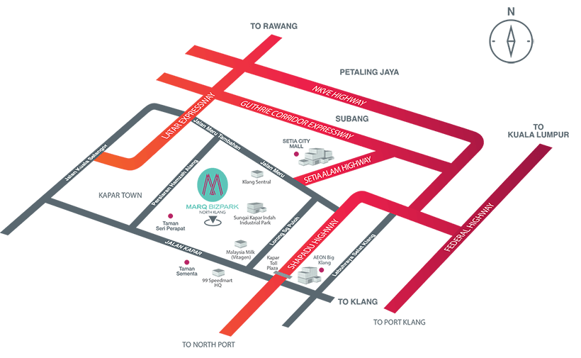 Surrounded by immediate vicinity of industrial properties with mixed residential and commercial properties MARQ BIZPARK is easily accessible via major highways.